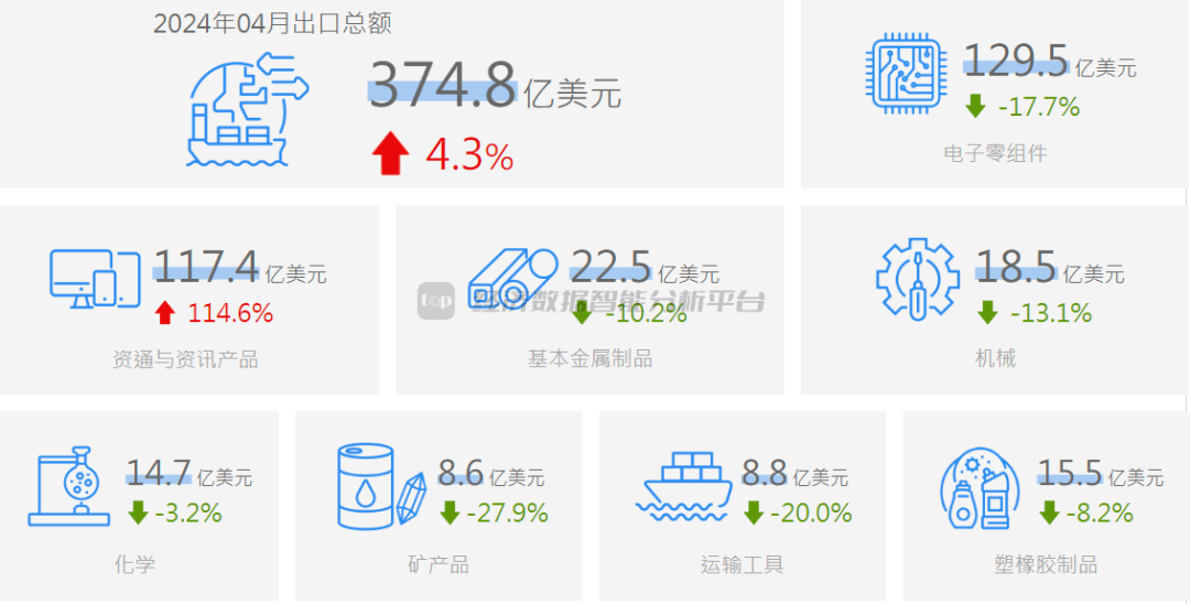 2024年1-4月,分重點出口商品來看,電子零組件出口528.06億美元,下降7.3%,佔總出口的35.7%;資通與資訊產品出口423.17億美元,增長121.6%,佔總出口的28.6%;基本金屬製品出口91.18億美元,下降5.9%;機械出口73.23億美元,下降5.0%;塑料、橡膠及其製品出口62.93億美元,下降6.6%;化學品出口59.80億美元,下降6.1%;礦產品出口46.51億美元,下降7.4%;電機產品出口40.69億美元,下降6.7%;光學及精密儀器出口34.54億美元,下降26.4%;運輸工具出口35.496億美元,下降19.6%;紡織品出口21.85億美元,下降4.2%。