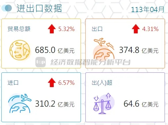 台灣地區貿易統計機構5月8日發佈了2024年4月份台灣地區進出口貿易初步數據。數據顯示,2024年4月,台灣地區貨物進出口總值為685.00億美元,同比增長5.3%。其中,貨物出口總值為374.80億美元,同比增長4.3%;貨物進口總值為310.20億美元,同比增長6.6%;貨物貿易順差為64.60億美元,同比減少5.4%。
