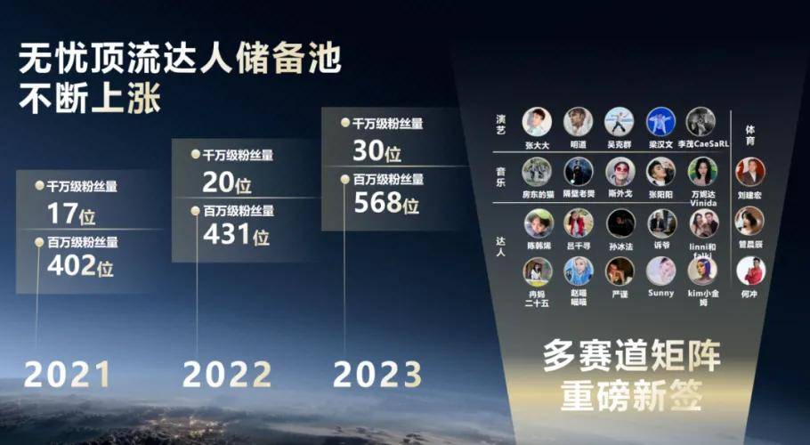 一方面,無憂給到達人清晰的規劃和明確的成長路徑,讓人人都能夠找到自己最擅長的賽道;另一方面,大批量的才藝、劇情、知識、健身達人和明星們,也構成了無憂傳媒最強內容陣地。