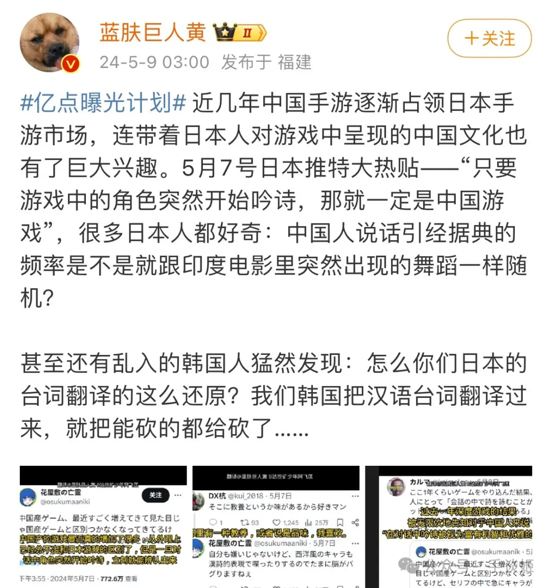 昨天微博網友“藍膚巨人黃”轉發B站翻譯的X網友發言,引起了一定的關注。X上網友感慨説,中國的手遊在日本的存在感已經很強了,從外觀上分不出區別,但其中的角色一旦開始唸詩,就能立刻辨認出是一款中國的手遊了。