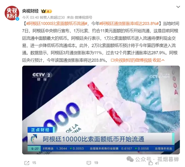 這兩天我在央視財經的社媒賬號上刷到一條新聞,説是從當地時間5月7日起,阿根廷中央銀行宣佈,面額1萬比索的大額鈔票開始正式流通了。這是目前阿根廷貨幣市場流通面額最大的比索鈔票。據阿根廷央行介紹,面額1萬的比索在流通之後將利好阿根廷的現金交易,進一步降低阿根廷比索鈔票的流通成本。此外,面額2萬比索鈔票預計也將於今年第四季度進入流通。