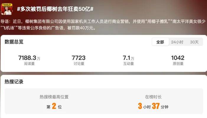 但是這還沒完,因為這個熱搜才是這個件事裏的第一個。很快,椰樹集團對關於自己被罰,發了一份聲明,省流看法只有三個字:「我不服」。