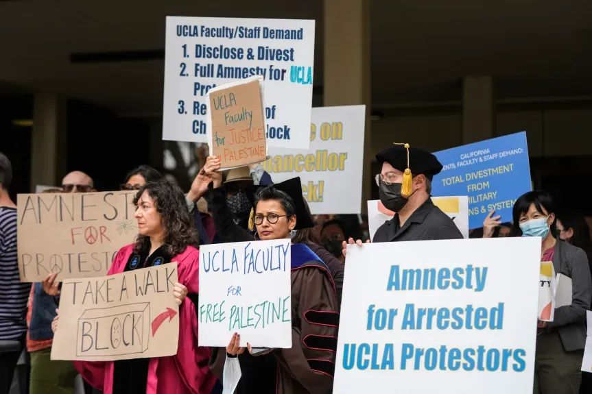 當地時間 5 月 9 日,美國加利福尼亞大學系統 800 餘名教職員工聯名請願,要求加州大學洛杉磯分校(UCLA)校長吉恩·布洛克(Gene Block)辭職,理由是在其管理下,校園內的親巴勒斯坦抗議學生和營地遭到了來自反對力量和警察的暴力襲擊。