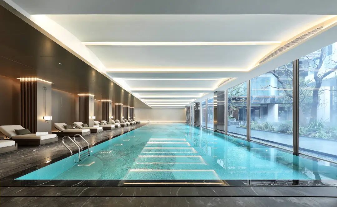 比如“漂浮”在水軸之上的私享會客廳……私宴包房推門移步就能看到,下沉庭院婀娜搖曳的烏桕樹。健身房、恆温泳池因為基本採用落地窗設計,即便你在運動之中,也能時刻觀賞庭院裏層層級跌的錯落風景。