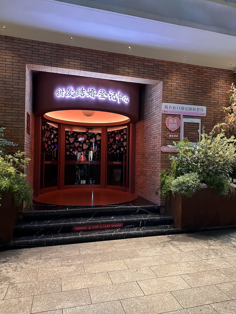回來的路上,看到一個奇葩去處:甜愛結婚登記中心。好像和正經結婚登記沒關係,就是個噱頭地方。真有情侶到這裏假裝結婚嗎?抑或這裏真是結婚登記的地方?記得老早是到民政局去登記的,不是什麼地方都可以自説自話的。沒看到這裏掛民政局的牌子。門口還一個“我在虹口甜愛路很想你”。切,想什麼想!別瞎想有用沒用的。