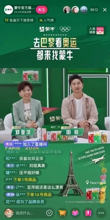 這種體育版權和社交平台的融合,不僅拓闊了賽場的邊界,也徹底改變了體育IP和贊助商與受眾的建聯方式,尤其是直播這種即時且深度互動的手段。因此,越來越多運動員做客直播間,以“品牌/頭部主播+體育明星”的方式破圈拓流,吸引更多體育消費人羣。2023年哈登、奧尼爾、菲戈、卡卡等NBA球星與足球明星就頻頻出現在各個直播間併為之火速積聚人氣。例如亞運會期間,“大鯊魚”來到小楊哥直播間與人扳手腕,直播間的人氣迅速達到100萬,小楊哥自家產品在十秒內售罄。而奧運會開幕在即,蒙牛直播間邀請了鄧亞萍和田亮等知名運動員,使得品牌活動迅速傳播,“去巴黎看奧運都來找蒙牛”的送門票營銷活動在抖音閲讀量過億,討論人數破萬。