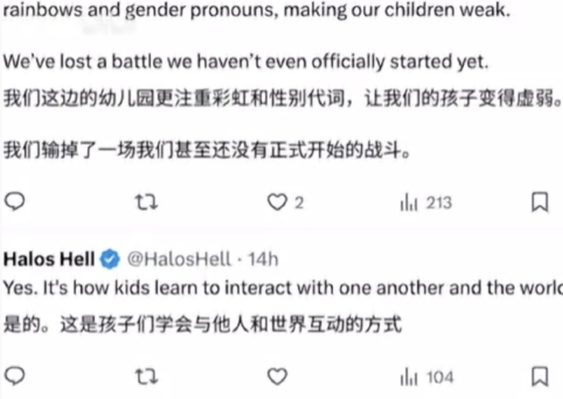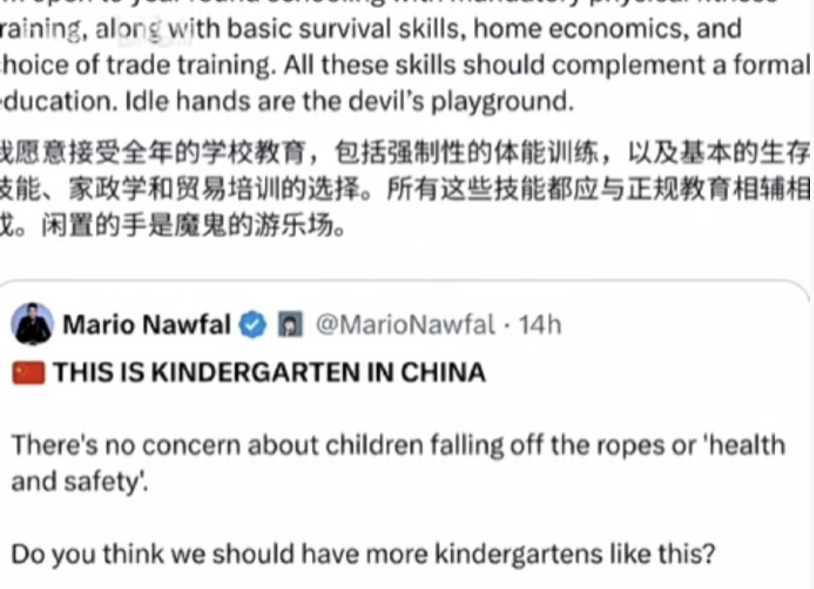 更離譜的是,美國版《讀者》和《意林》已經把中國小孩吹成了智力超羣、十項全能、武德充沛的小超人了,一個幼兒園、興趣班的視頻,都能讓美國人高潮,他們看到中國孩子跳繩、爬梯子、畫畫、解魔方、打乒乓球的畫面,一驚一乍,感慨中國的教育方式領先世界5000年,這樣的孩子才是“野蠻其體魄,文明其精神”……中國幼兒園的孩子文武雙全、技能點滿;而美國幼兒園的孩子正在被狗屎LGBT荼毒,天天教他們多少個性別,美國小孩已經成為了“毀掉的一代”,美國網友們痛心疾首、悲憤莫名,感嘆長此以往,國將不國,再不學習東方大國的教育,美國人就要被開除球籍了。