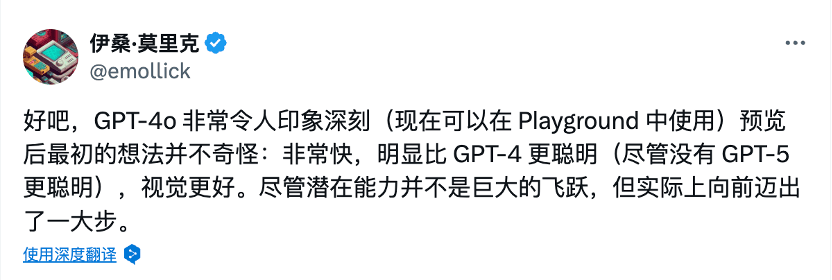 賓夕法尼亞大學沃頓商學院教授伊森·莫里克表示,GPT-4o 非常令人印象深刻,非常快,明顯比 GPT-4 更聰明(儘管沒有 GPT-5 更聰明),視覺更好。儘管潛在能力並不是巨大的飛躍,但實際上向前邁出了一大步。