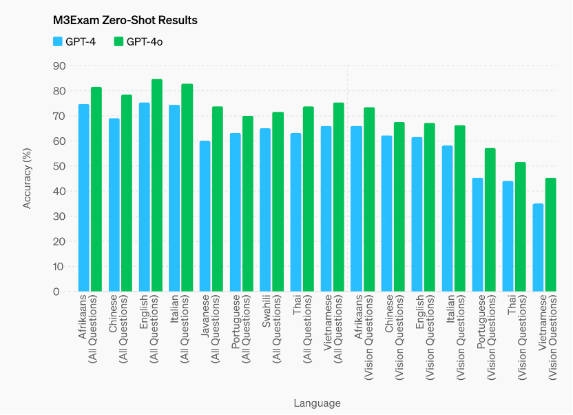視覺理解方面,GPT-4o在M3Exam基準和視覺感知基準上都有不錯的表現。其中,M3Exam基準是多語言和視覺評估,由來自其他國家標準化測試的多項選擇題組成,有時包括圖形和圖表。在所有語言的基準測試中,GPT-4o都比 GPT-4更強。