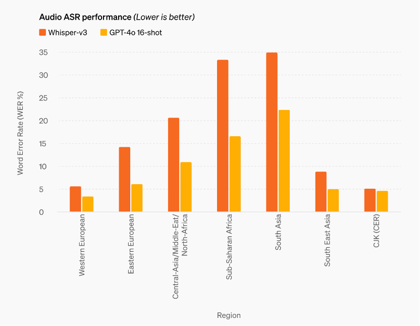 第二,更強的多語言能力,GPT-4o 50 種不同語言中的性能得到了提高,包括改進了分詞器以更好地壓縮其中的許多語言。GPT-4o 比 Whisper-v3 顯着提高了所有語言的語音識別性能,特別是對於資源匱乏的語言。