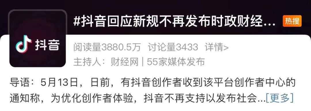 消息一出,就被外界解讀為抖音將限制發佈時政、財經、法律或醫療內容。雖然經公司證明為不屬實,但抖音方並未完全否認相關新規,只是強調相關調整為商業素材發佈授權功能,不影響創作者的其他變現或者商業化能力。