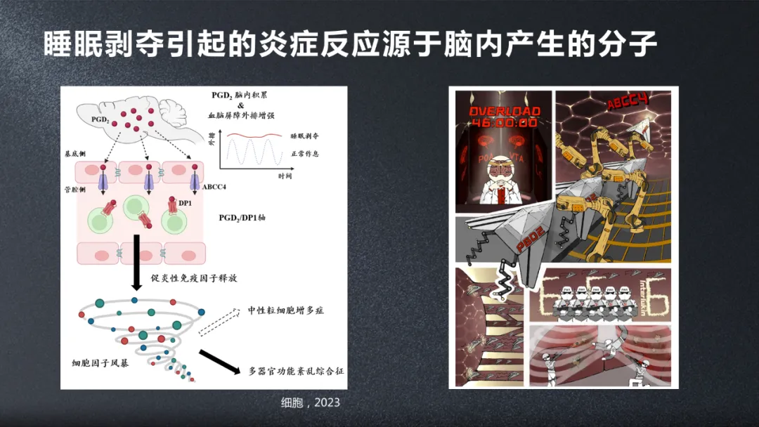 大家可以看一下我們同學們畫的科普漫畫,我試圖來講解一下。就是睡眠不足的時候,我們腦內產生了前列腺素D2的分子,然後不僅僅是增加了它的產生,而且它的通透性,通過血腦屏障的通透性也增加了,然後從腦裏進入到血液裏,然後導致了白細胞一系列的反應,最後產生了白細胞攻擊全身各個器官,所以這個事件就是我們的一個發現。