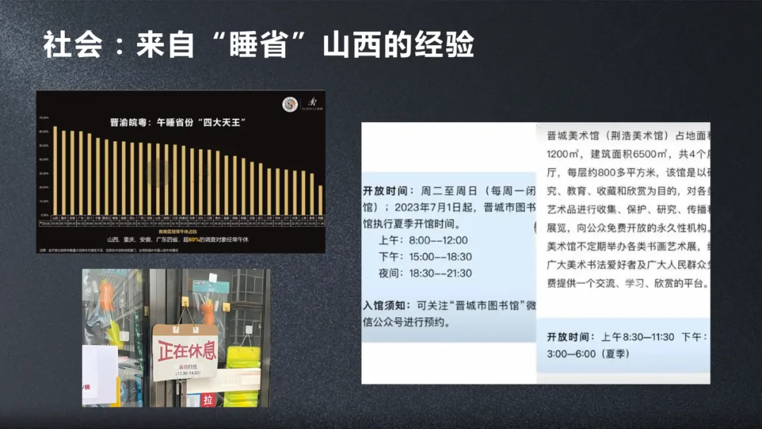 山西其實是我們著名的“睡”省,是一個很有名的非常重視午休的省,這其實是非常好的一個事情。山西人據説他們中午肯定是不串門的,中午像這些參觀的美術館都要關門讓大家好好休息的,甚至火車站的鐘聲 中午都是不敲的,這都是非常好的關注大家睡眠,從社會的角度來關心大家的睡眠。