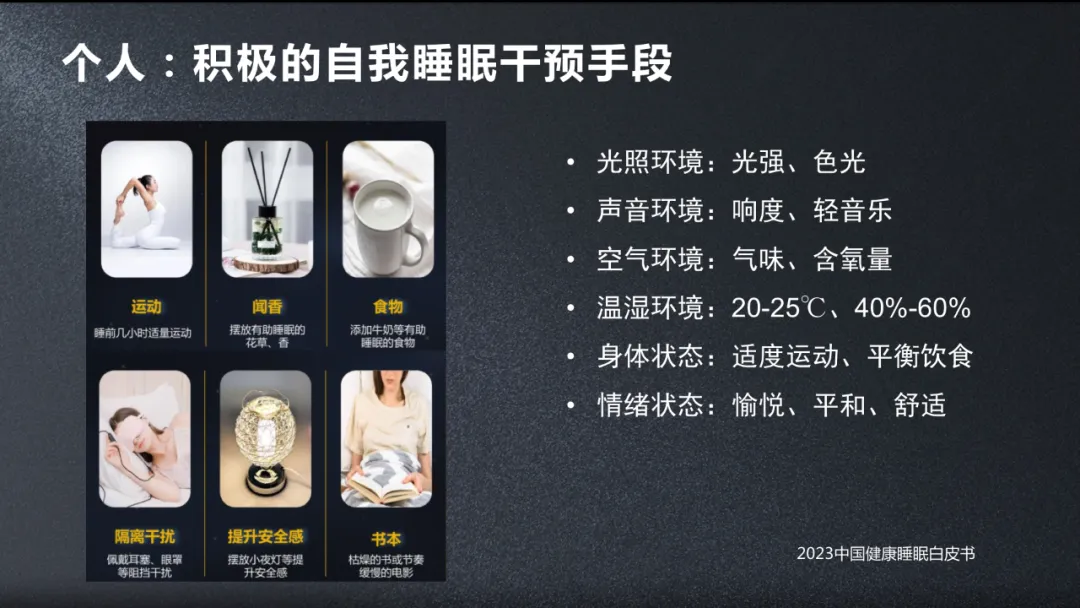 還有一個就是聲音、空氣,另外温度也是會影響的。我們知道夏天天氣太熱肯定睡不好,適當地降低温度,比如開空調會幫助我們有很好的睡眠,這是個人健康方面。