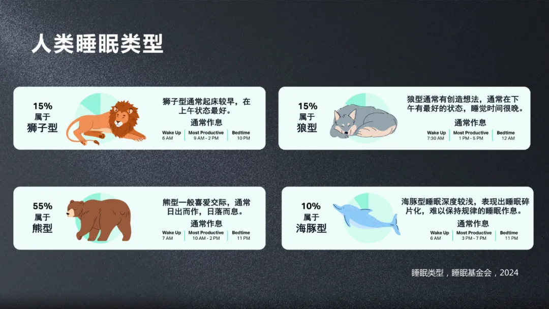 我們知道人類睡眠長短是由睡眠穩態控制的,而睡眠實相是由生物鐘晝夜節律控制的。我們有早睡早起的獅子型的,也有晚睡晚起的狼型的,但是絕大多數是屬於正常的熊型的,日出而作,日落而息,但還是有10%的人睡眠,其實不是很規律,是碎片化的,這一類的人我們叫做海豚型,但是多數人是處於亞健康狀態,我們儘量避免這種情況的發生。