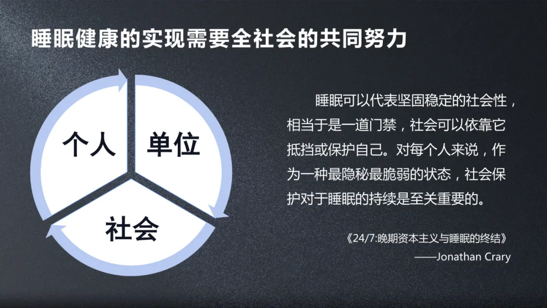 最後我想引用哥倫比亞大學教授的話,個人的睡眠對社會是非常重要的,而社會通過關心個人的睡眠健康,對維持和諧社會,也是一個非常有益的幫助。
