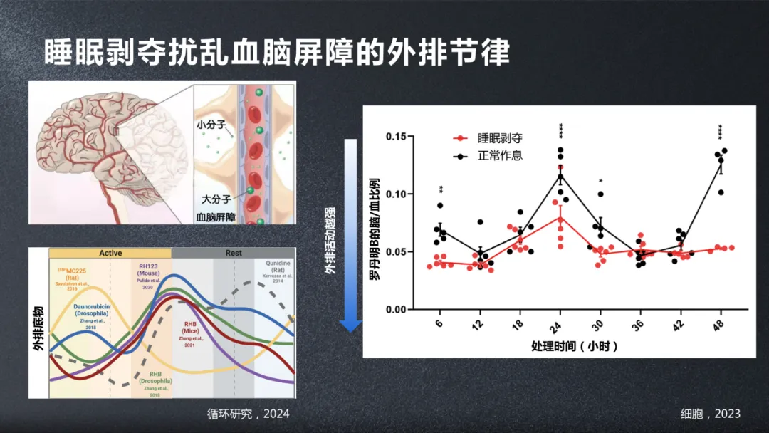 而血腦屏障外排其實是有晝夜節律的,而我們發現對於小鼠進行睡眠剝奪了之後,它會擾亂它的外排節律,而且極大地增加它的外排節律,至少對我們(研究)的這類分子是這樣的。