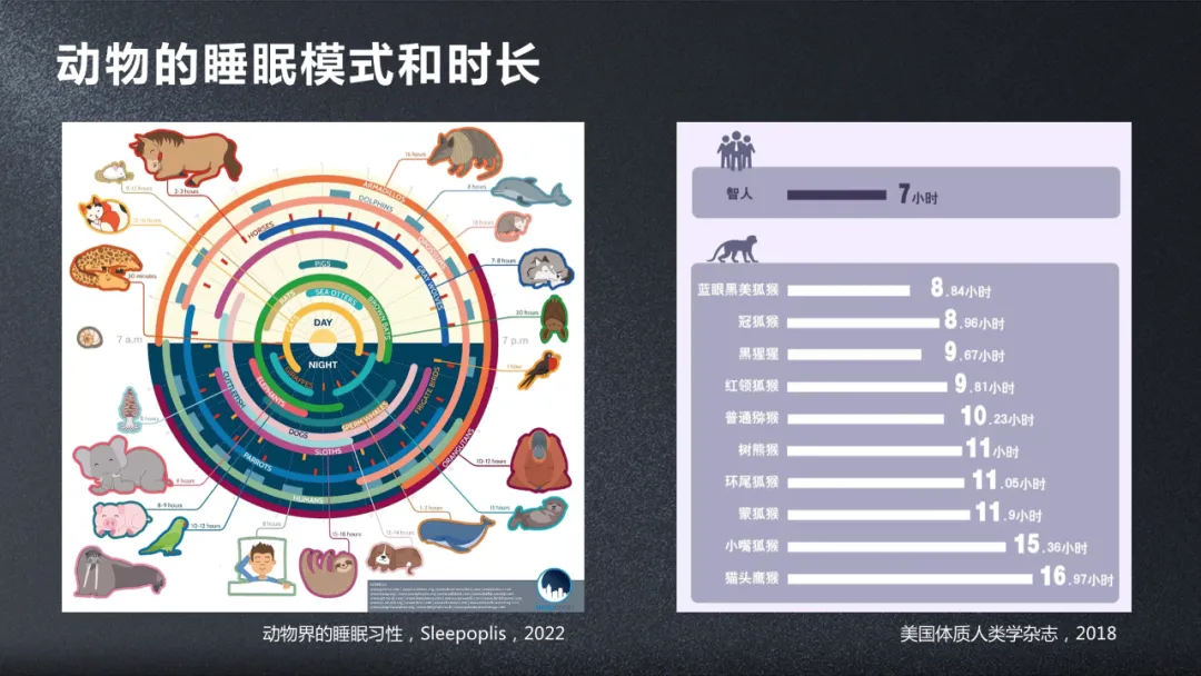 對於哺乳動物來説,睡眠的長短也是非常不一樣的,比如像長頸鹿,每一天只需要睡30分鐘左右,而睡得最多的一類是蝙蝠,還有一類就是考拉熊,它們一天要睡20多個小時,靈長類睡眠長短也是不一樣的,而我們人是比較拼的,在靈長類內是睡眠時間最短的。