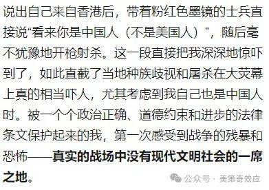 這部電影中,有個情節,叛軍逮到四個平民,其中三個是白人,一個是亞裔,叛軍就開始問“你們是那種美國人”,看起來就是要分“紅脖子”還是“白左”,分別問四個人來自哪裏,白人説自己來自科羅拉多等美國本土的州,那個亞裔説自己來自香港,叛軍回了句“哦,中國?”,然後二話不説,一槍就把他斃了。