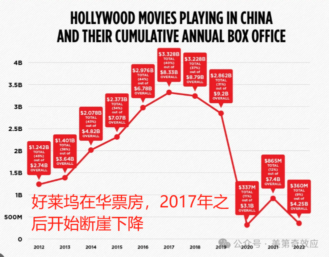 但是,雖然好萊塢賣力搞中國元素,好萊塢電影在中國的票房卻斷崖下降。從2017年最高點33億美元,開始逐年下降,到了2022年票房只剩下來3.6億美元,不剩十分之一,市場份額從2010年最高的55%,下降到只剩15%。