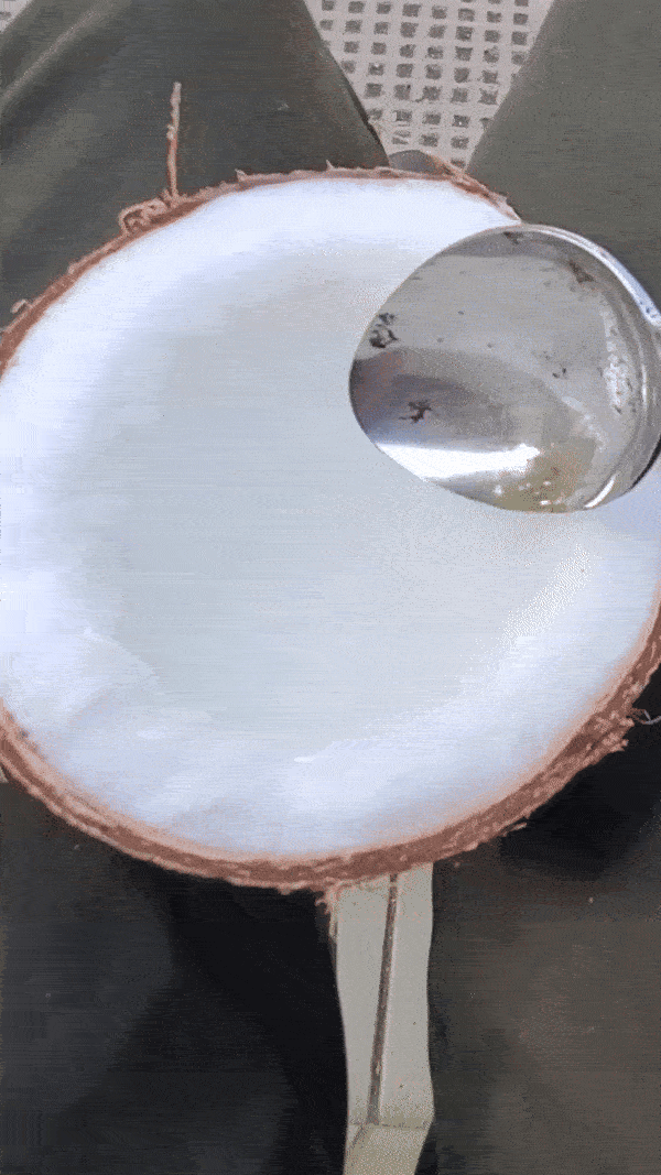 椰子打開後不是你所熟知流動性較高的椰汁,而是有彈性的膠狀物,但又有點糯糯的,看起來口感很棒。