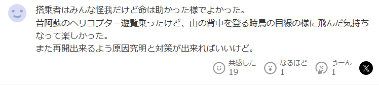 雖然所有乘客都受傷了,但他們都倖免於難真的是太好了。我以前曾在阿蘇火山乘坐直升機遊覽過,很喜歡那種飛上後山的感覺,就像鳥瞰一樣。我希望事故原因能夠得到調查,並採取對策,使直升機能夠再次恢復運行。