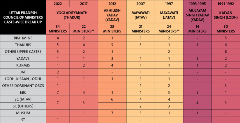**儘管表現不盡如人意,但1993年BSP-SP聯盟的內閣和部長會議仍是北方邦歷史上構成最多樣化的。**1993年,SP領導人穆拉亞姆擔任首席部長,其政府的27位部長中有9位是主要種姓OBC(主要是亞達夫),而內閣中有4位亞達夫。6位部長是EBC,但只有1位在內閣任職,其餘均為國務部長。6名達利特部長中有3人進入內閣。有3位穆斯林部長,其中一位來自受壓迫種姓。只有3位部長是上層種姓。1997年,BSP領導人瑪雅瓦蒂在印人黨的支持下再次上台執政,在她不到一年的執政時間裏,其政府的45名部長中有7名EBC和10名達利特人——其中6名是賈塔夫。瑪雅瓦蒂政府內閣中的上層種姓人數仍多於EBC或達利特。