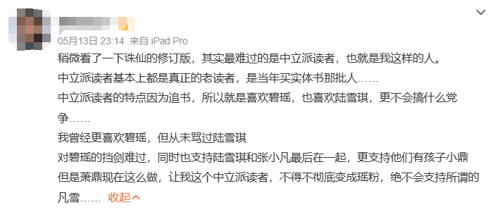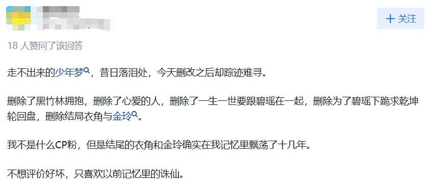 二十年來,《誅仙》能夠維持熱度,甚至不時衝上熱搜,除了改編的影視內容外,與粉絲羣體樂於表達,用自己的角度和方式解讀作品和喜愛的角色不無關係。如今作者蕭鼎親自下場為二十年來《誅仙》這部作品最大的話題蓋棺定論,無疑是直接否定掉了一部分粉絲對作品和角色的喜愛,與將其閉麥無異。而粉絲們想要爭取的那個美好結局,碧瑤再也等不到了。