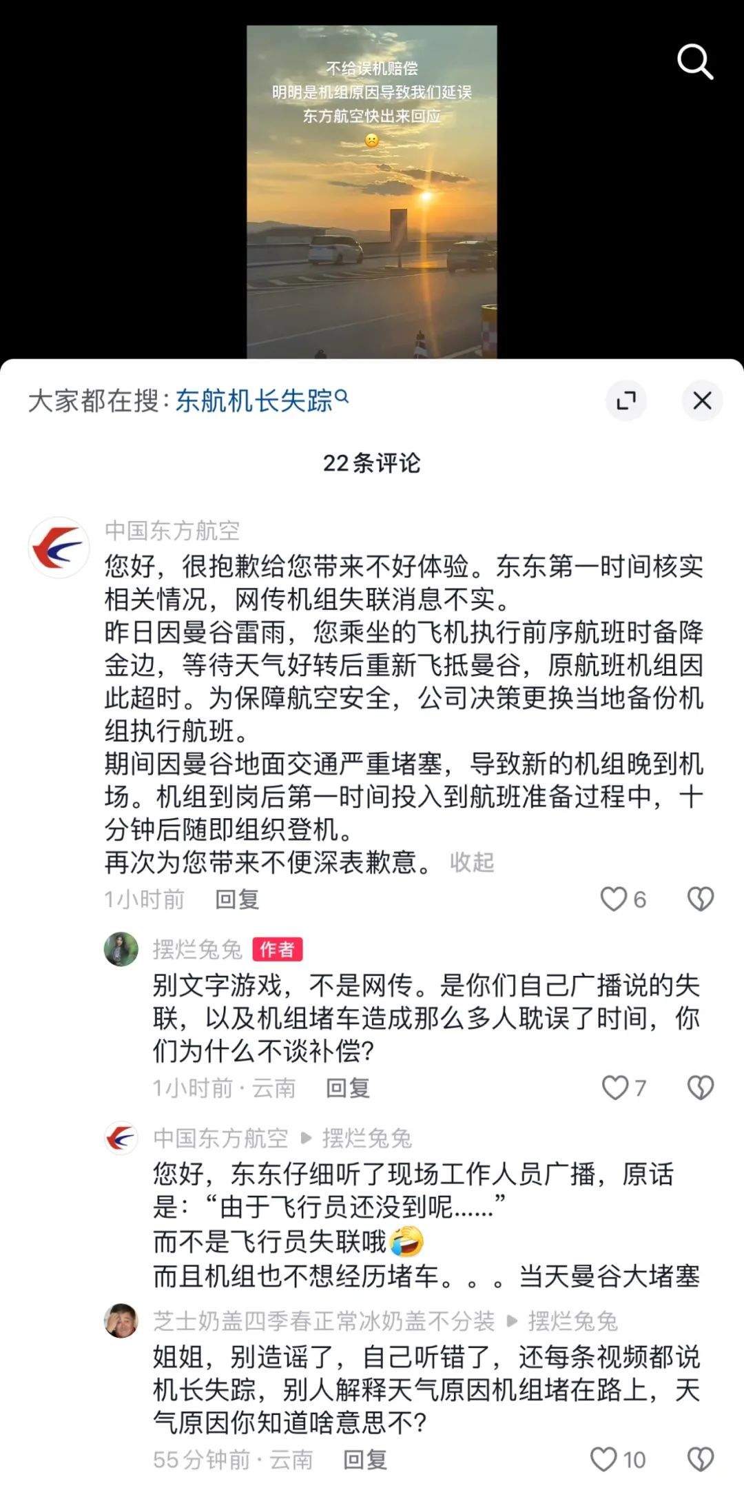 列位請看,就是這麼簡單。東航在這件事情上處理沒有任何問題,但他預感不了天氣,預感不了堵車,預感不了曼谷機場員工的蹩腳廣播,再加上因航班延誤本就不滿的旅客煽風點火,一場莫名其妙的輿情就這麼來了。