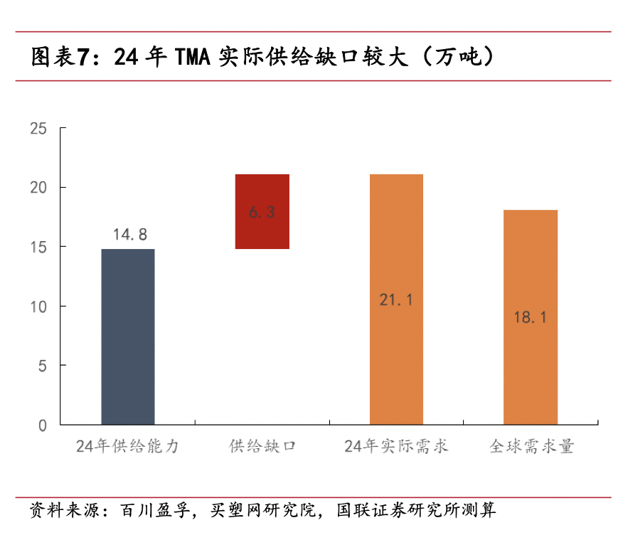 國聯證券研報指出,TMA價格向上頗具彈性和持續性。2024年實際需求約可量化為21.1萬噸,供給缺口達6.3萬噸,約佔實際總需求的30%。疊加TMA的剛需屬性且短期無新增產能投放,TMA 高景氣週期有望持續較長時間。
