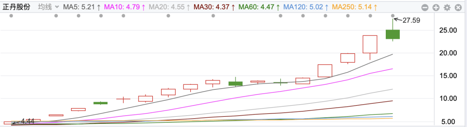 5月14日,復牌後的首個交易日,大牛股正丹股份(300641.SZ)上午一度漲超近15%,但尾盤跳水收跌3.69%,報23.00元/股,成交額超23億元,換手率高達18.02%。