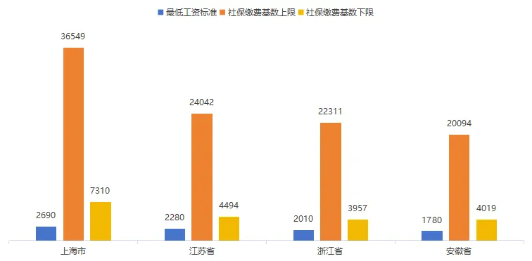 2023年,安徽省職工社保繳費基數下限為4019元每月,上限為20094元每月,同樣排在長三角地區的“守門員”位置。