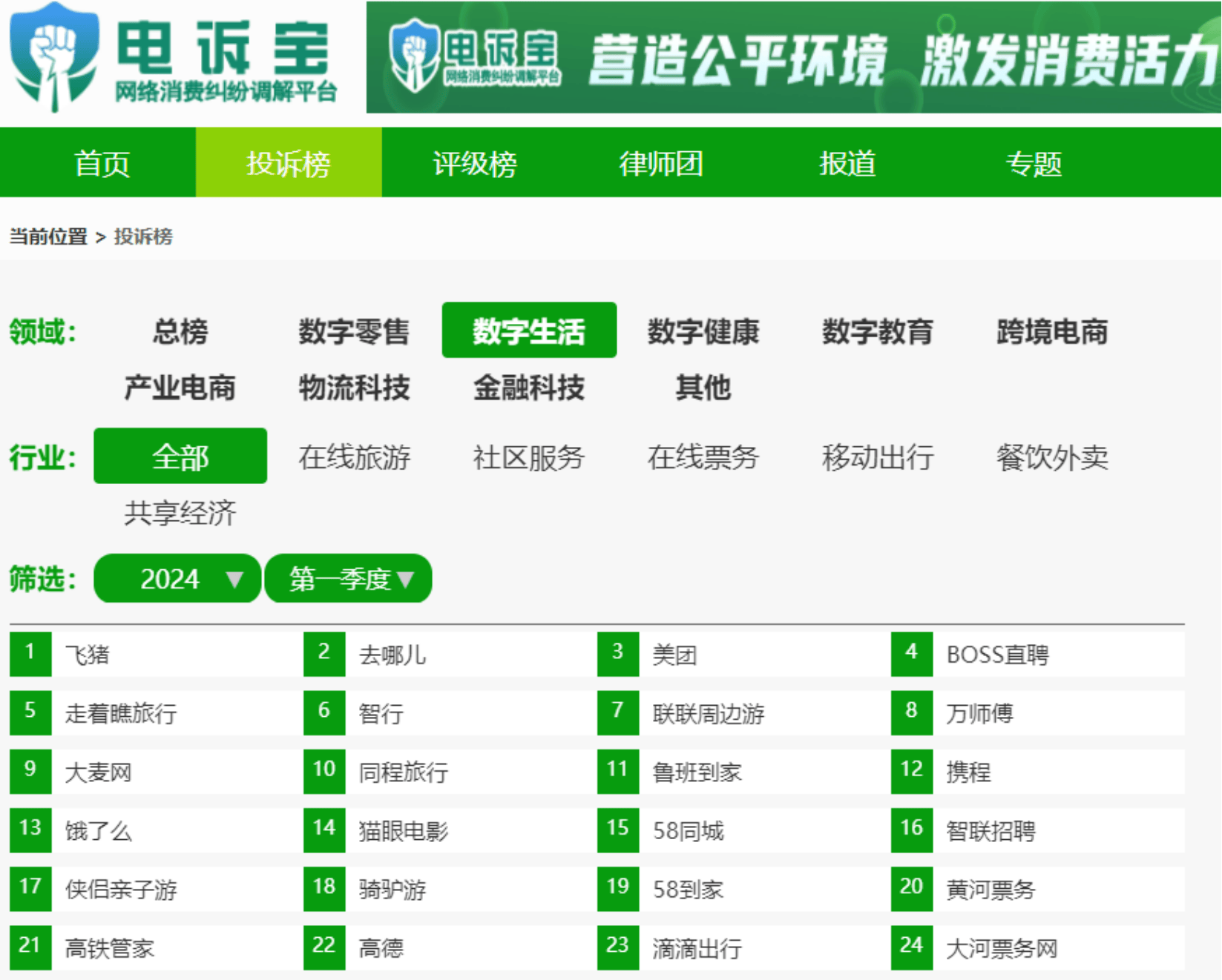 根據“電訴寶”2024 年Q1受理的中國數字生活領域用户有效投訴顯示,投訴量 TOP10 依次為:飛豬、去哪兒、美團、BOSS直聘、走着瞧旅行、智行、聯聯周邊遊、萬師傅、大麥網、同程旅行;