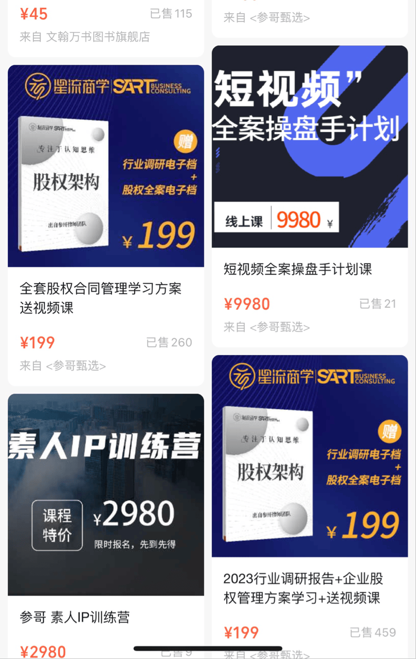 娛樂獨角獸發現,海蔘哥課程品類覆蓋了情商、股權合理管理、IP孵化等等,價格梯度從199元到8萬元不等。目前在“參哥帶你成長”視頻號店鋪中在銷售的包括素人IP訓練營、全套股權合同管理。其中線上課程“短視頻炒盤手計劃課”售價9980元。