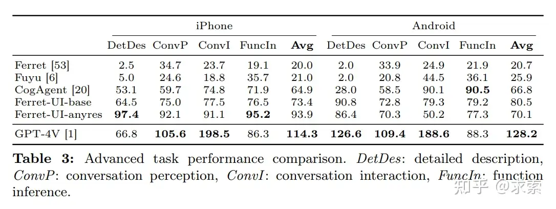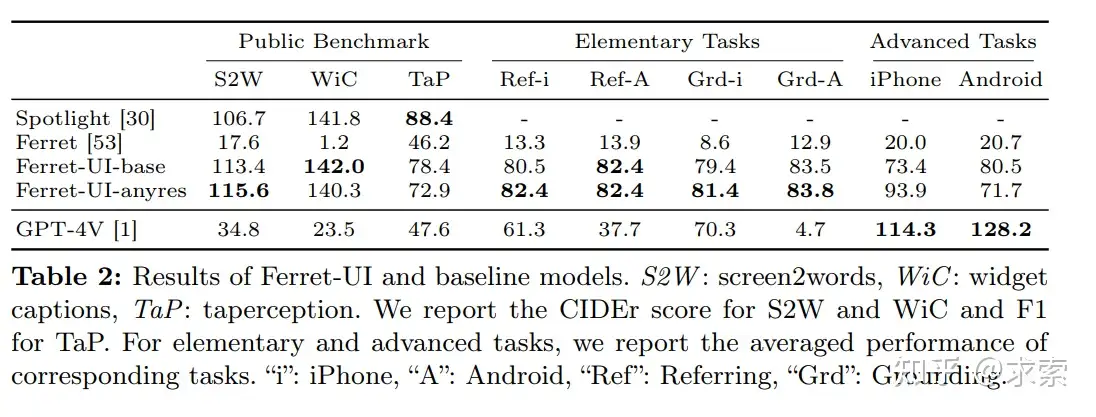 針對UI屏幕的定製化MLLM:Ferret-UI是首個專為UI屏幕設計的MLLM,能夠有效執行指定、定位和推理任務。任意分辨率技術的集成:通過將整個屏幕分成為子圖像,每個屏幕根據原始縱橫比分為2個子圖像(即縱向屏幕的水平分割和橫屏的垂直分割),以便同時適應豎屏和橫屏,這樣能夠靈活地適應各種屏幕長寬比,並且利用增強的視覺特徵放大細節,因此Ferret-UI能夠更好地處理UI屏幕的細節。廣泛的訓練樣本收集:研究者們為基本UI任務和高級任務生成了大量數據,這些數據涵蓋了從簡單的語義和空間任務到複雜的推理任務。綜合測試基準:研究者們開發了一個包含14種不同移動UI任務的全面測試基準,用於評估模型的性能。卓越的性能:在評估中,Ferret-UI不僅超越了大多數開源的UI MLLMs,還在所有基本UI任務上超過了GPT-4V(複雜任務還是不如GPT-4V,估計還得在複雜任務的訓練集上做文章)。