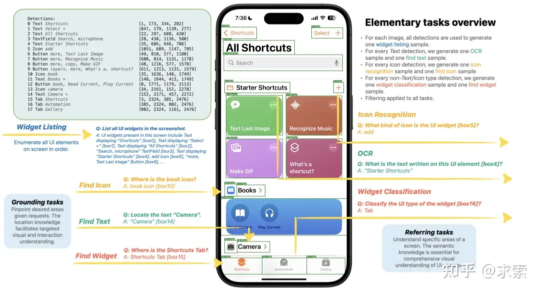 在收集了Android和iPhone的屏幕後,作者使用基於預訓練的基於像素的UI檢測模型進一步從屏幕中收集細粒度的元素註釋。對於每個檢測到的 UI 元素,輸出包括 UI 類型(按鈕、文本、圖標、圖片等)、相應的邊界框以及由 Apple Vision Framework 標識的文本(如果有)。進一步使用屏幕識別的啓發式方法將單個檢測分組為更大的單元,例如,將多行文本合併為一組,將圖像與其標題分組等。