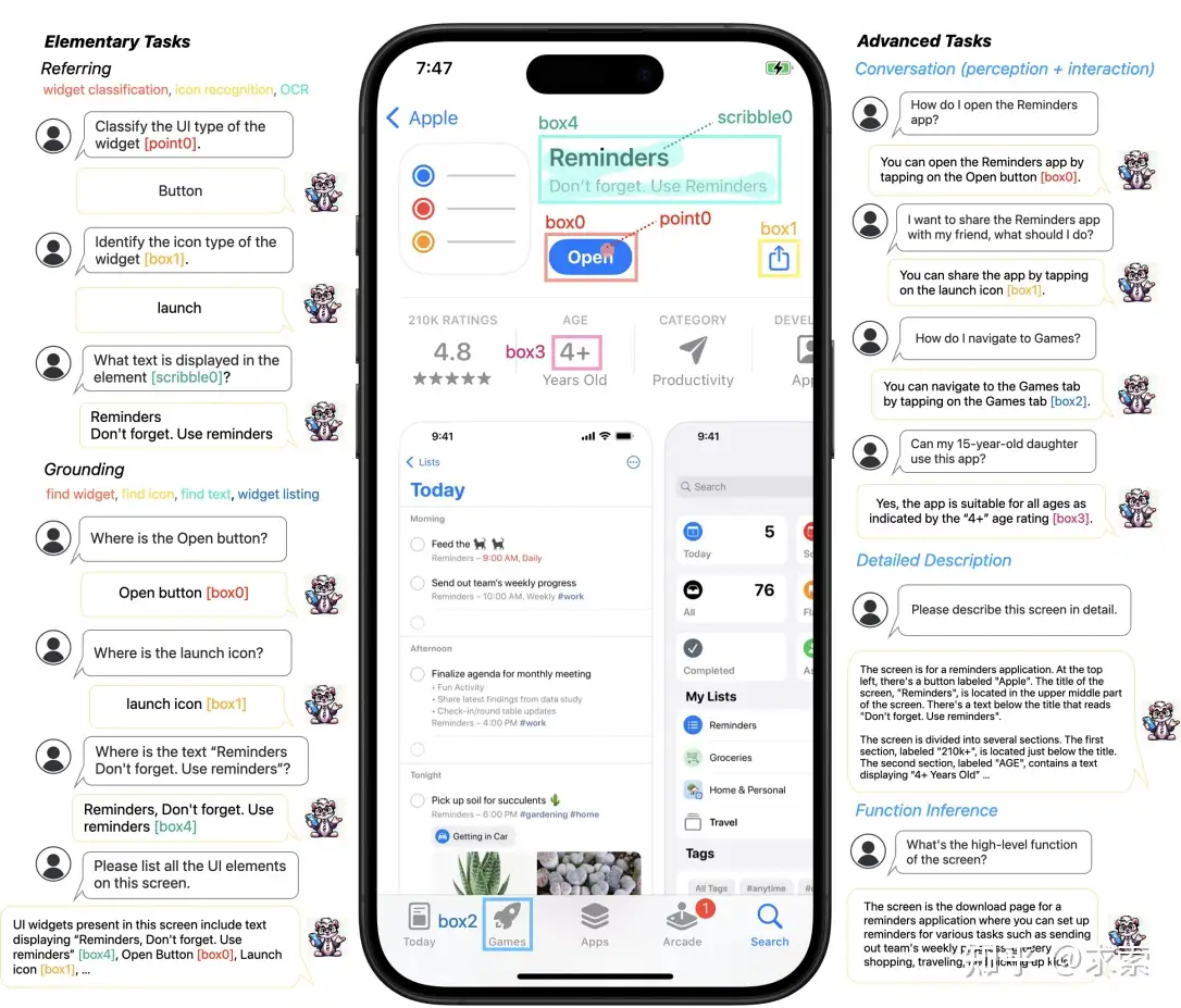 此外,研究者們從廣泛的基本UI任務中精心收集訓練樣本,如圖標識別、文本查找和控件列表,併為高級任務編制了數據集,包括詳細描述、感知/交互對話和功能推斷。這些樣本被格式化為帶有區域註釋的指令遵循格式,以促進精確的參照和定位。