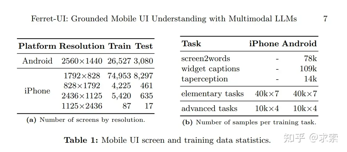 為了解決這個問題,將 SPHINX、LLaVA-NeXT和 Monkey中提倡的“任何分辨率”(anyres)的概念應用於 FerretUI。具體來説,選擇了兩種網格配置,1x2 和 2x1,它們是根據Table 1a 中描述的原始屏幕的縱橫比選擇的。給定一個屏幕,選擇最接近其原始縱橫比的網格配置。隨後,屏幕大小調整以適合選定的網格配置,然後被劃分為子圖像。直觀地説,縱向屏幕是水平劃分的,而橫向屏幕是垂直劃分的。所有子圖像都使用相同的圖像編碼器單獨編碼,並且 LLM 使用所有不同粒度的視覺特徵以及完整的圖像上下文和增強的細節。