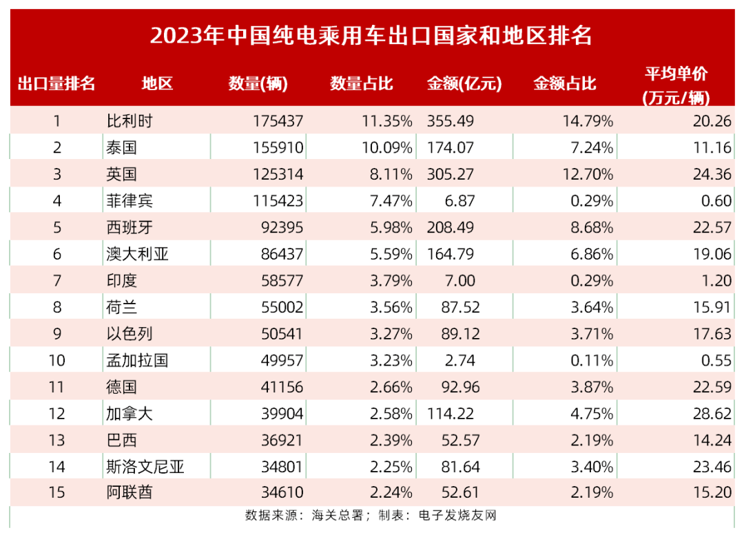 而從出口地區來看,中國電動汽車目前的主要出口地是歐洲以及東南亞等地,去年中國純電汽車出口量最大的目的地是比利時,超過了17萬輛,佔整體出口量的11.35%,平均單價也較高,達到20.26萬元。