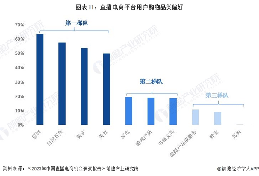 《2023年中國直播電商機會洞察報告》顯示,超50%的直播電商用户偏好在直播電商平台購買服飾、日用百貨、美食等產品。