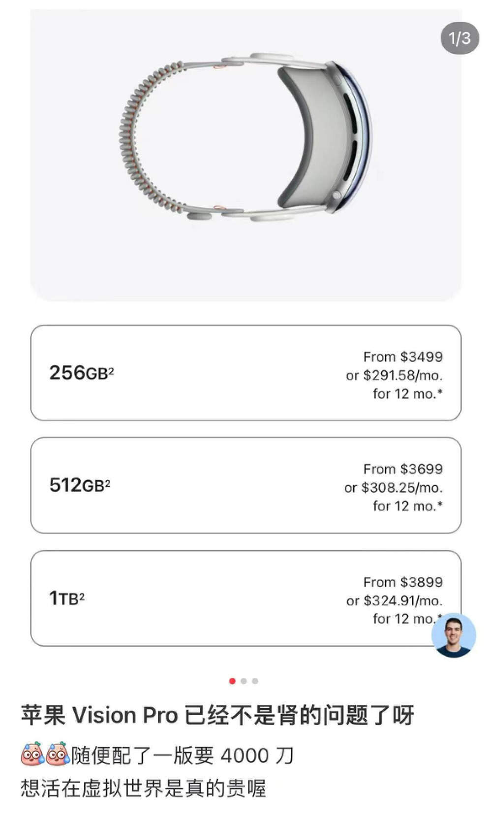 首先,是定價策略。Vision最大的標籤,是貴。蘋果一共提供了三個內存版本:256G、512G和1TB。對應售價分別為3499美元(約25311元)、3699美元(約26758元)和3899美元(約28206元)。注意,這還只是裸機價格,如果想要獲得更好的體驗,需要“出血”的地方還有不少。