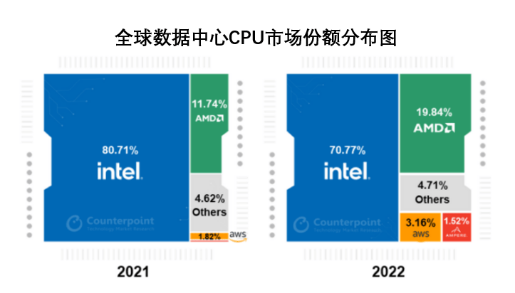 Counterpoint 數據顯示,2022 年英特爾的數據中心 CPU 市場份額從 2021 年的 80.71% 下滑到了 70.77% 。