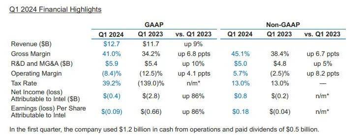 一開始我以為是營收出問題了,去翻了翻兩家最近的財報發現, 2024 財年第一季度 AMD 的營收是 54.73 億美元,英特爾 127 億美元。