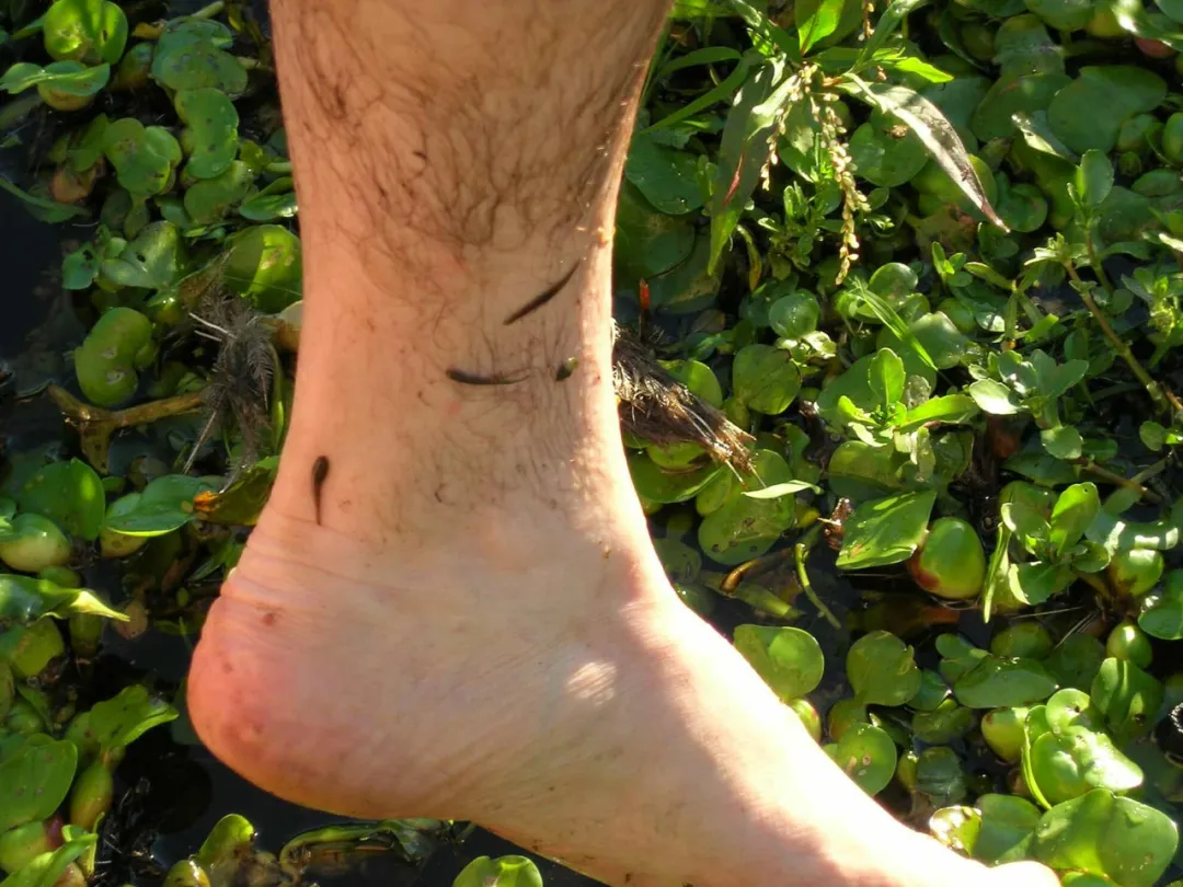 為了找到並收集水蛭,有些研究人員拿自己當誘餌。等水蛭吃飽了,它們就會自動脱落,掉進研究人員準備好的袋子裏。圖片來源:American Museum of Natural History