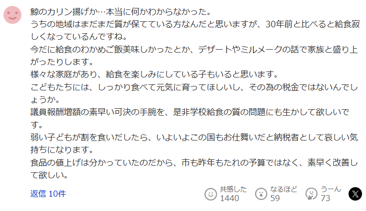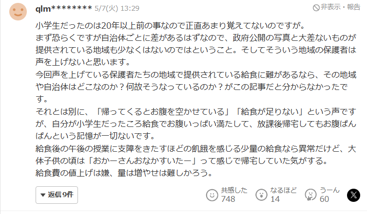 20 多年前我還在上小學,關於午餐內容所以我真的記不太清了。首先,可能是各市之間存在差異,所以提供的照片與政府公佈的相差無幾的地區並不在少數。我想這些地區的家長也不會大聲疾呼。如果這次發聲的家長所在地區的學校午餐存在困難,那麼是哪個地區或哪個市呢?為什麼會這樣?這篇文章並沒有説清楚。除此以外,還有聲音説回家後肚子餓,學校午餐不夠,但我上小學時,都是用學校午餐填飽肚子的,我完全不記得放學回家後肚子餓過。如果只是因為吃了少量的學校午餐而感到飢餓,以至於影響了下午放學後的課程,那才是不正常的,但我想我小時候一般都是帶着 “媽媽,我餓了 “的感覺回家的。一邊不希望伙食費漲價,一邊午餐的量應該也很難增加。