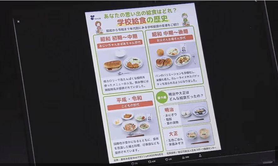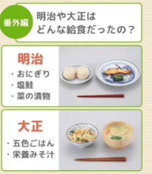 照片中介紹了從明治、大正時代到令和年日本學校午餐的演變情況。