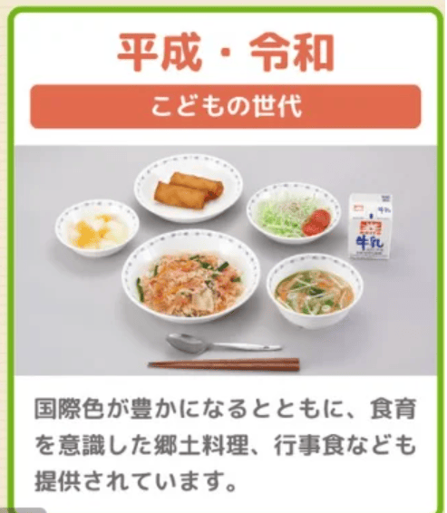 平成、令和年代(1989年~如今)學校的午餐變得尤其豐富。還添加了國際化的色彩。除了日本的本土料理外、中國的春捲和其他國家的食材也會加入其中。