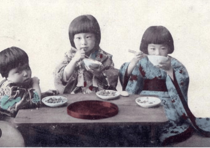 明治時期(1868年~1912年)學校的午餐大概是飯糰、三文魚和小鹹菜。