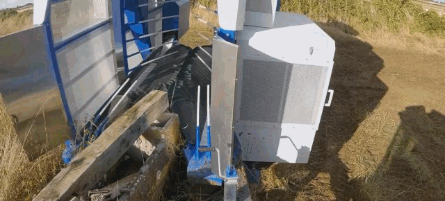 樹籬牆前端有一排瓦片牆,黑莓採摘機需要先通過這一段才能進行採摘。