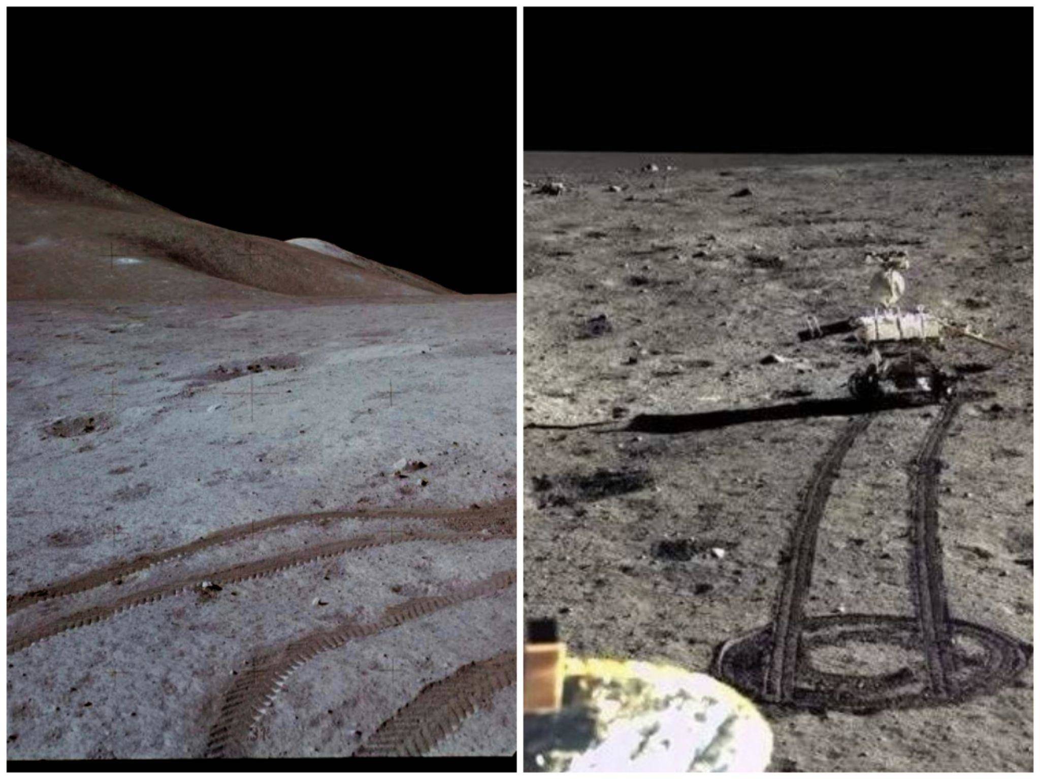 可以看到,嫦娥號有明顯的車輪印,車輪印顏色比未擾動的月壤更深,而阿波羅的顏色沒有變化。